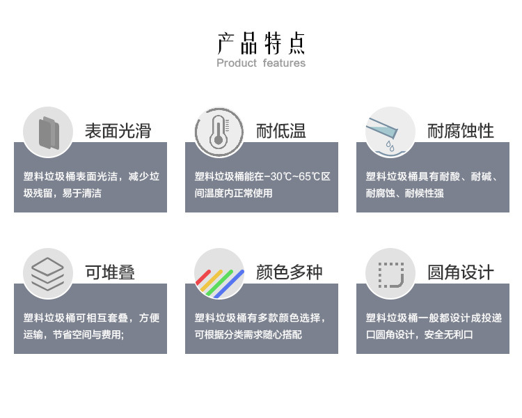 4.塑料垃圾桶填充严密,密封严实四周无缝隙,桶体日久不变形,不变色,不变脆,具有耐热、耐冻、耐冲击、耐腐蚀、抗老化性能好等特点。